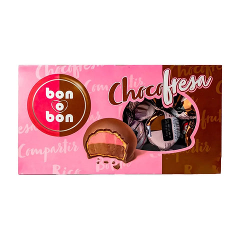 Discover a delightful blend of chocolate and fruit with Bon O Bon Chocolate Fresa. This smooth chocolate bonbon is filled with a luscious strawberry cream center, wrapped in a crisp outer shell. It's a vibrant twist on a classic favorite.