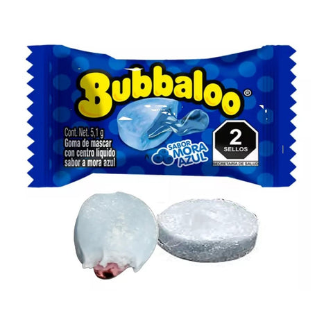 Bubbaloo Chicle Mora Azul (47ct) hits with juicy blueberry and a signature gum burst inside-deep blue flavor, Latin flair.