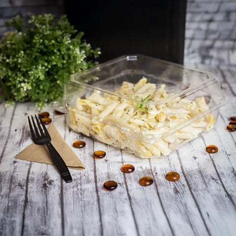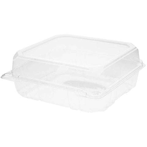 Ideal for larger portions, this 8x8 PET hinged container provides space, structure, and clarity for meal service or food prep.