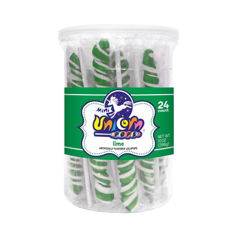 Mini Unicorn Pops Apple (Bright Green) swirl tart green apple into a bright candy spiral—zesty, playful, and eye-catching for candy bars.